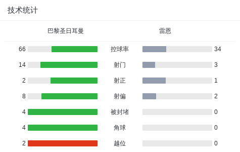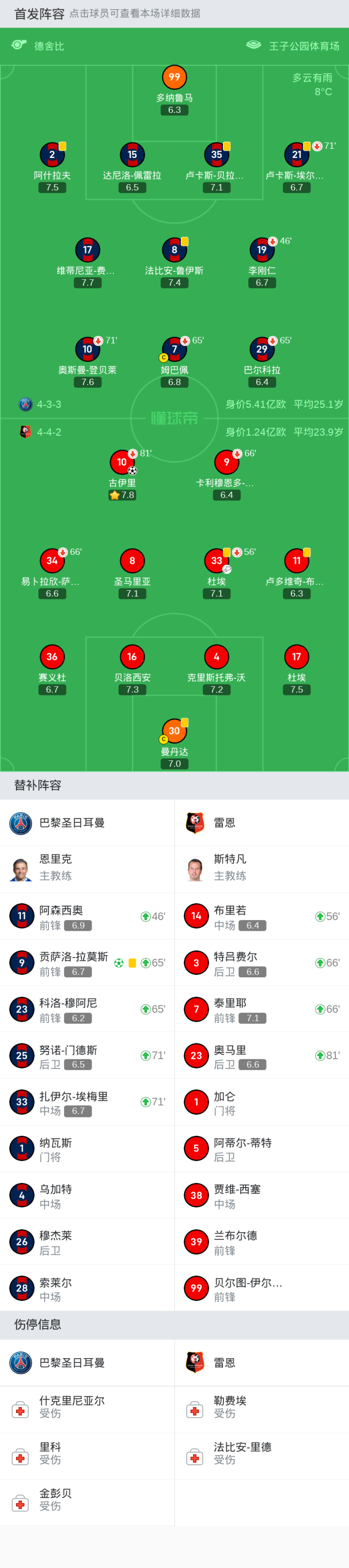 北京时间2月26日法甲 联赛 第23轮,巴黎圣日耳曼主场对阵雷恩。上半场,维蒂尼亚抽射被曼丹达下地扑出,古伊里摆脱数人后外脚背挑射破门,古伊里再次过掉两名防守后推射打偏;下半场,登贝莱兜射被扑,姆巴佩远射稍稍高出,布里若近距离包抄踢偏,佩雷拉头球接力顶高一点,拉莫斯造点并主罚命中完成绝平。最终比分1-1。