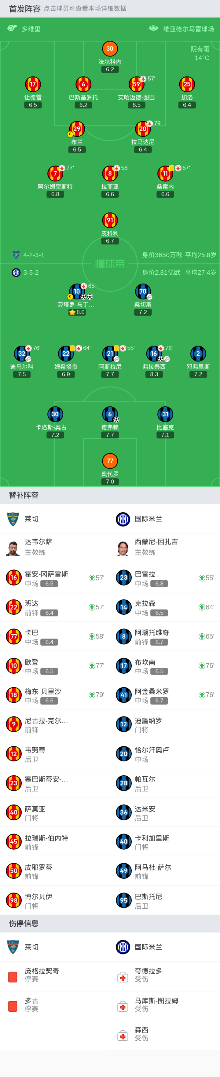 莱切首发:11-桑索内, 30-法尔科内, 29-布兰, 20-拉马达尼, 6-巴斯基罗托, 8-拉菲亚, 59-艾哈迈德-图巴, 7-阿尔姆奎斯特, 25-加洛, 17-让德雷, 91-皮科利