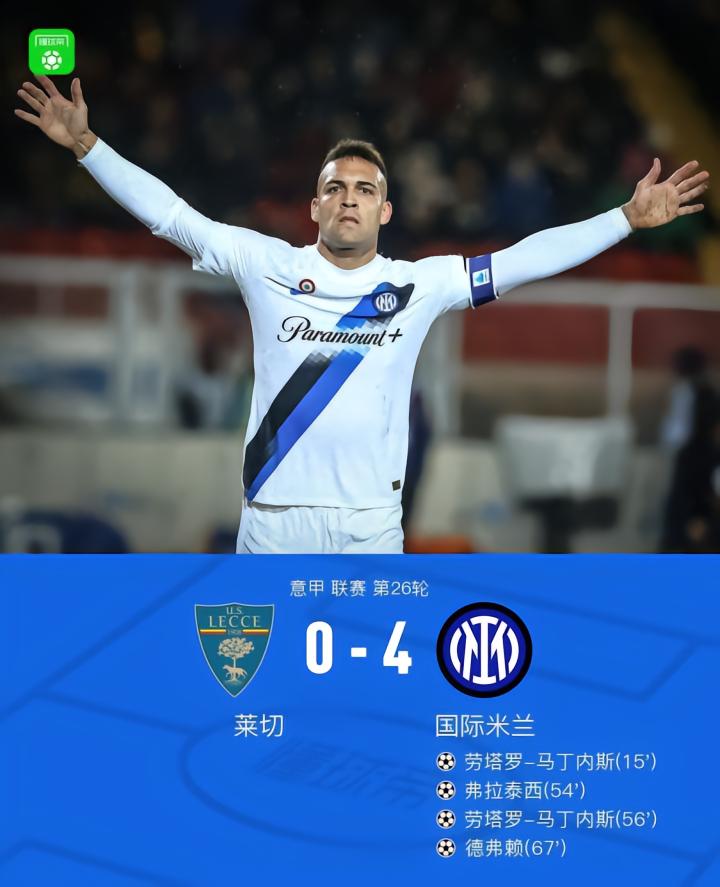 北京时间2月26日意甲 联赛 第26轮,莱切主场对阵国际米兰。劳塔罗捅射破门攻入意甲百球,姆希塔良打门踢偏,下半场桑切斯助攻弗拉泰西推射扩大比分,劳塔罗推射梅开二度,德弗赖头球得分锁定胜局,最终国米4-0大胜莱切。