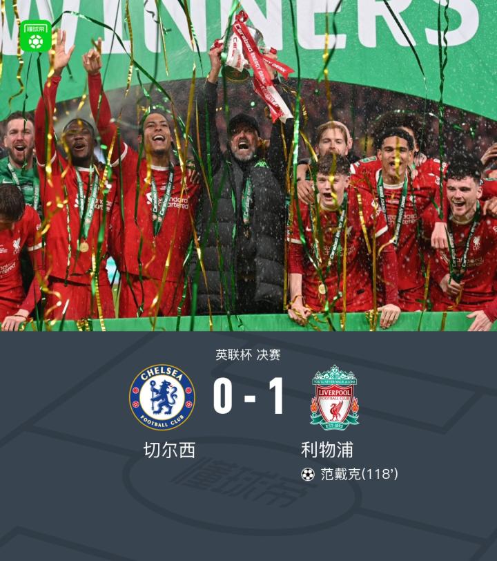 【利物浦1-0切尔西第10次夺英联杯冠军!范戴克加时赛绝杀】