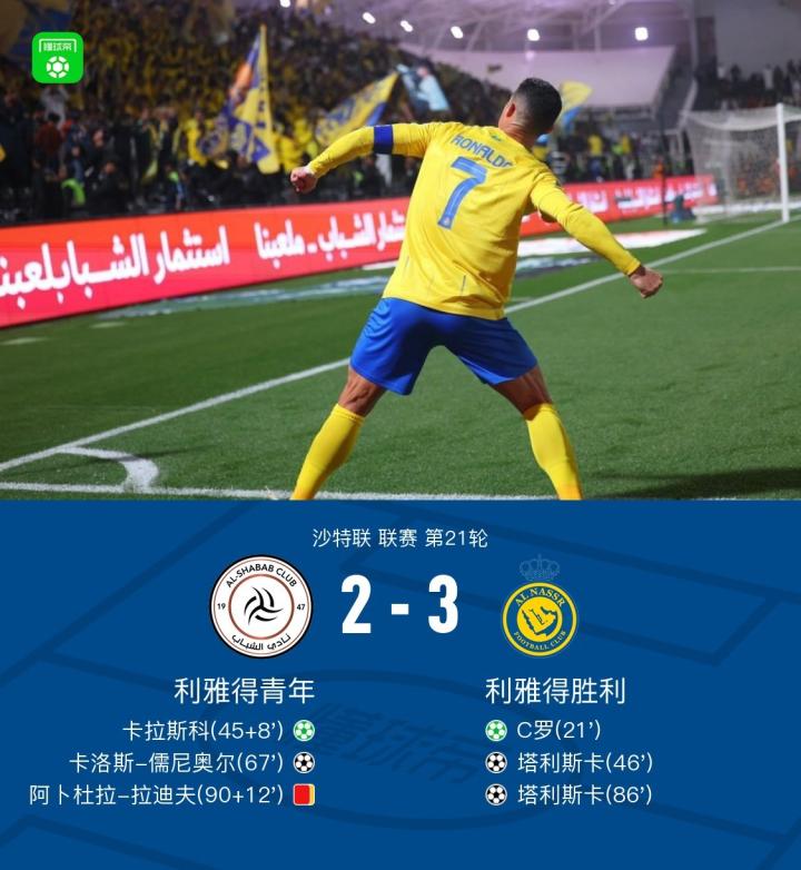 【利雅得胜利3-2利雅得青年,C罗连续9场破门,塔利斯卡双响】