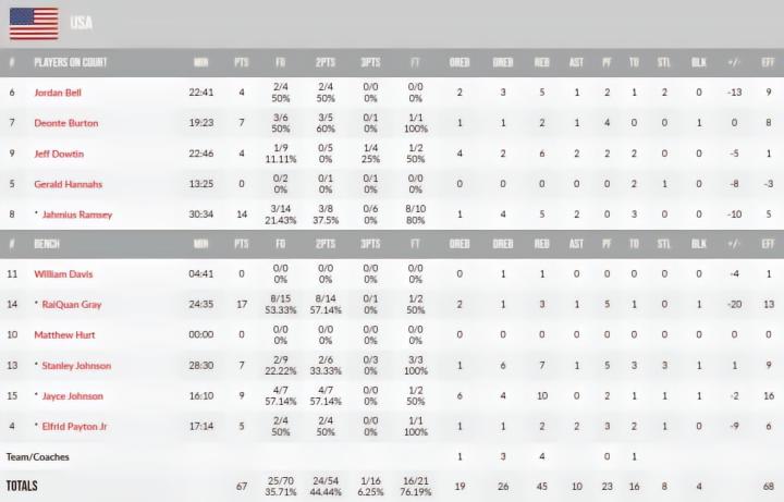 这支美国男篮主要由NBA发展联盟球员组成,此役全队仅2人得分上双,雷匡-格雷17分,热迈厄斯-拉姆齐14分,乔丹-贝尔4分5篮板。