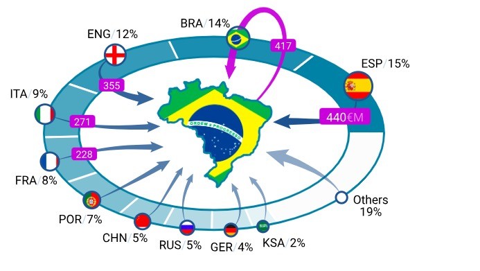 与分析的其他国家不同,英国并不是巴西在国际市场上的主要资金来源。在过去的十年里,巴西俱乐部在西班牙创造了最多的转会收入(4.4亿欧元)。英格兰排名第三(3.55亿欧元),仅次于国内市场(4.17亿欧元)。后者仅占总数的14%。巴西球队确实能够将球员转移到许多不同的国家。中国在这些转会里占据了5%的资金来源。