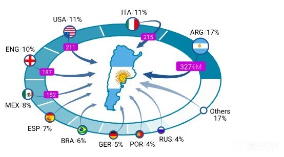在过去十年中,虽然2014年至2023年间,国内市场占阿根廷俱乐部转会收入的17%,来自六个国家的团队投资超过1亿欧元:意大利(2.15亿欧元)、美国(2.11亿欧元),英国(1.87亿欧元)和墨西哥(1.52亿欧元)。