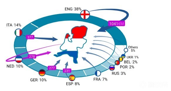 英格兰是荷兰球队的主要市场。在过去十年中,荷兰俱乐部38%的转会收入来自英格兰(10.4亿欧元),几乎是第二大市场意大利(3.77亿欧元,占总收入的14%)的三倍。国内转会(2.78亿欧元)仅占荷兰球队赔偿总额的10%。