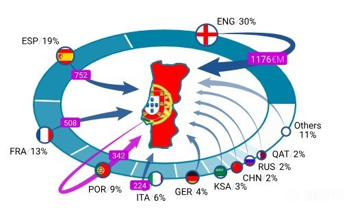 到目前为止,英格兰是葡萄牙俱乐部最大的市场。在过去的十年里,他们在那里创造了近12亿欧元的收入,相当于所有转让收入的30%。相比之下,国内收入仅为3.42亿欧元(占总收入的9%),远低于英国、西班牙(7.52亿欧元,19%)和法国(5.08亿欧元,13%)的收入。