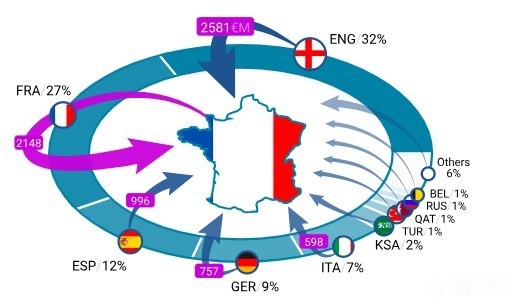 法国是2014年至2023年间俱乐部收取转会费最多的第三个国家。与英格兰和意大利球队不同,法国俱乐部的大部分收入来自国际转会。英格兰队平均每年约2.5亿欧元,是迄今为止法国队最大的外国买家(占总收入的32%),其次是西班牙(12%)、德国(9%)和意大利(7%)。