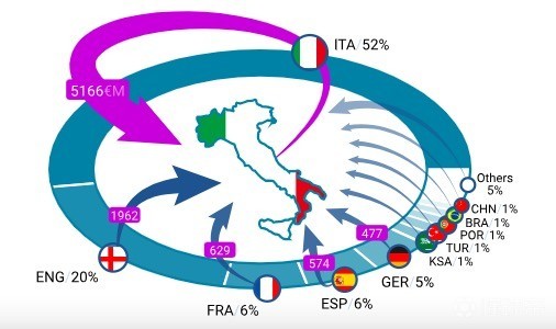 与英国一样,国内市场也是意大利非常重要的收入来源。在过去十年中,国家转移支付占收入的52%。就国际市场而言,英格兰脱颖而出,平均每年向意大利球队支付近2亿欧元(占总额的20%),是第二大外国资金来源法国(尤其是巴黎圣日耳曼)的三倍。中国占据了意甲的1%。