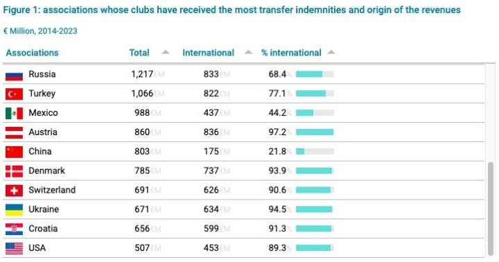 在过去十年中,俱乐部获得最多转会补偿的20个国家中,海外转会产生的收入比例从英格兰的37%到奥地利的97%不等。除英格兰外,只有三个国家的球队从外国俱乐部获得的资金少于国内俱乐部:中国(22%)、墨西哥(44%)和意大利(48%)。
