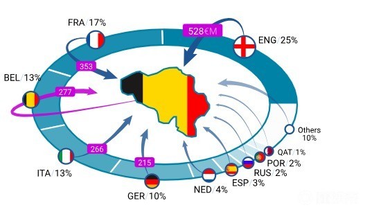 过去十年,英国俱乐部在比利时投资5.28亿欧元,是比利时球队的主要资金来源(占总资金的25%),其次是法国俱乐部(3.53亿欧元,17%)和国家市场(2.77亿欧元,13%)。意大利和德国拥有超过2亿欧元,也是比利时俱乐部球员的主要市场。荷兰的收入较低(8000万欧元),但仍高于西班牙的收入(5700万欧元)。