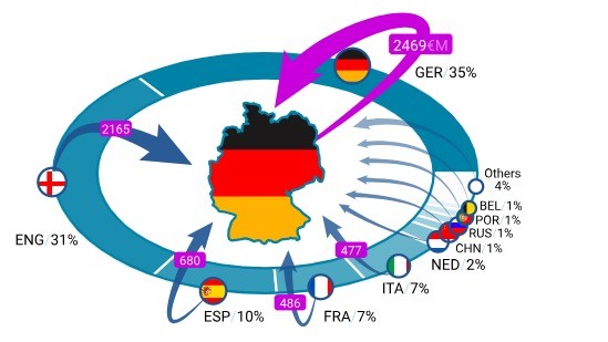 与西班牙俱乐部一样,2014年至2023年间,德国球队获得的大部分转会收入来自国内(22.4亿欧元,占总收入的35%)或英格兰(21.6亿欧元;31%)。与主办五大联赛的所有协会一样,在德国,这些国家也是主要资金提供者的前五名(总收入的90%),这反映出该地区存在一个极具活力的市场。