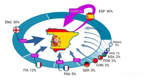当谈到球员转会时,西班牙球队的两个主要选择是国内市场和英国俱乐部。国内转账(23.4亿欧元)或向英格兰转账(同样为23.4亿英镑)产生的收入占过去十年收到金额的60%。意大利是第二大国际资金提供者(9.12亿欧元,占总额的12%),其次是法国(6.65亿欧元,5%)。