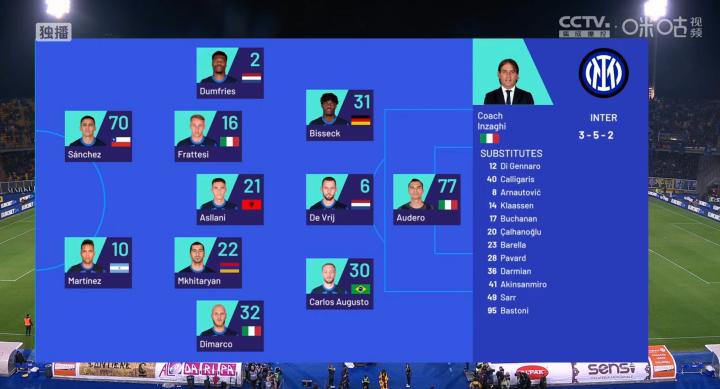本场的首发尽管大面积轮换,然而小因的布阵还是稳的,两条边路都是主力带替补——邓弗里斯带着比塞克镇守右路,迪马尔科带着奥古斯托拿捏左路,中场阿斯拉尼首发后腰的情况下配以姆西塔良来辅佐,一方面最大程度轮休主力,一方面确保三分入账。