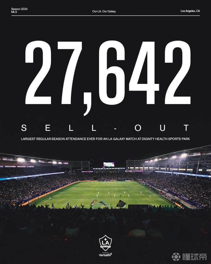洛杉矶银河官方消息,作为球队新赛季首个主场比赛,此役门票售罄,现场观众人数为27642人。