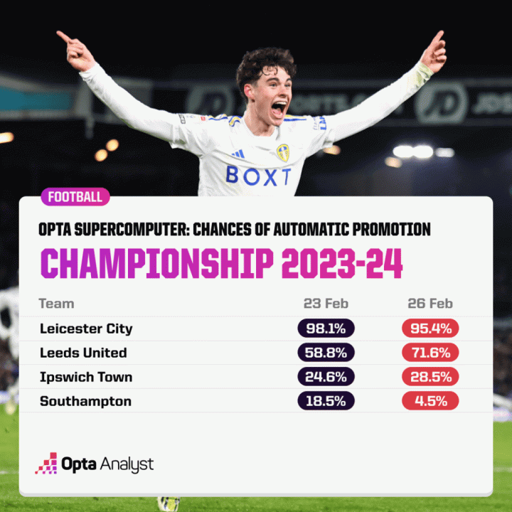 上周末,利兹联主场3-1逆转莱斯特城,将双方之间的分差缩小到6分。加上南安普顿上周末主场不敌米尔沃尔,利兹联直升的概率从58.8%升至71.6%。