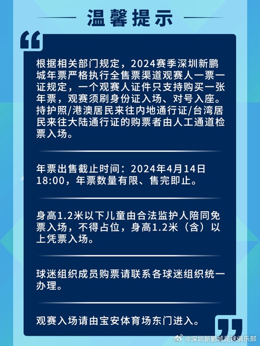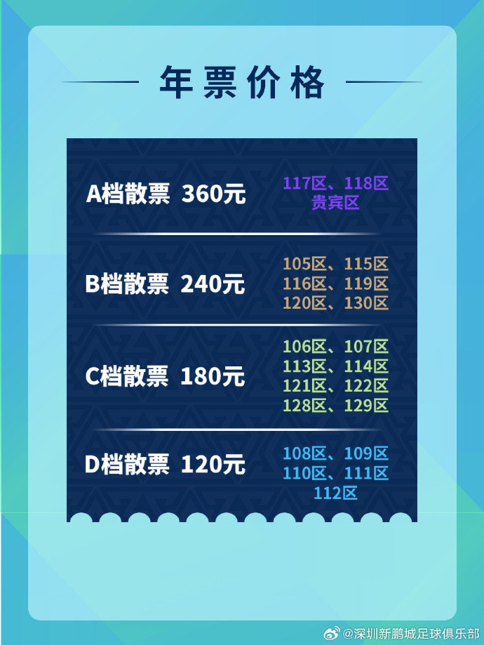 深圳新鹏城年票价格:学生年票600元,D档850元,A档1500元ETChalmers @懂球帝2024-02-27 15:58深圳新鹏城开售新赛季主场年票,学生年票为600元,最高1500元。深圳新鹏城新赛季主场为深圳宝安体育场,购买年票的球迷将获得官方年票礼盒一份。深圳新鹏城年票价格A档:1500元B档:1200元C档:950元D档:850元学生年票:600元散票价格A档:360元B档:240元C档:180元D档:120元展开更多