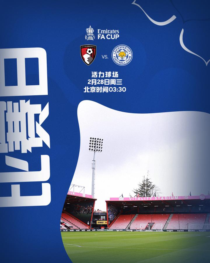 足总杯第五轮 🆚 伯恩茅斯 📍 活力球场⏰ 周三...LCFC莱斯特城足球俱乐部 @懂球帝2024-02-27 18:41足总杯第五轮 🆚 伯恩茅斯 📍 活力球场 ⏰ 周三凌晨3:30 📺 B站展开更多