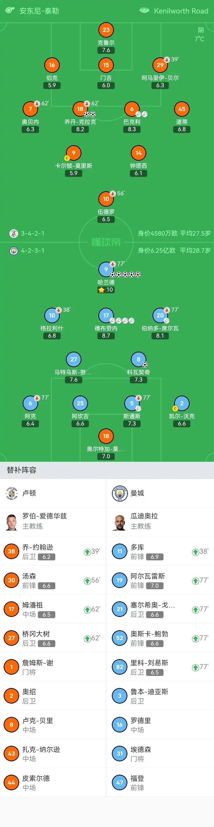 卢顿首发:23-克鲁尔, 6-巴克利, 10-伍德罗, 18-乔丹-克拉克, 29-阿马里伊-贝尔, 9-卡尔顿-莫里斯, 16-伯克, 7-奥贝内, 14-钟塔西, 45-道蒂, 15-门吉