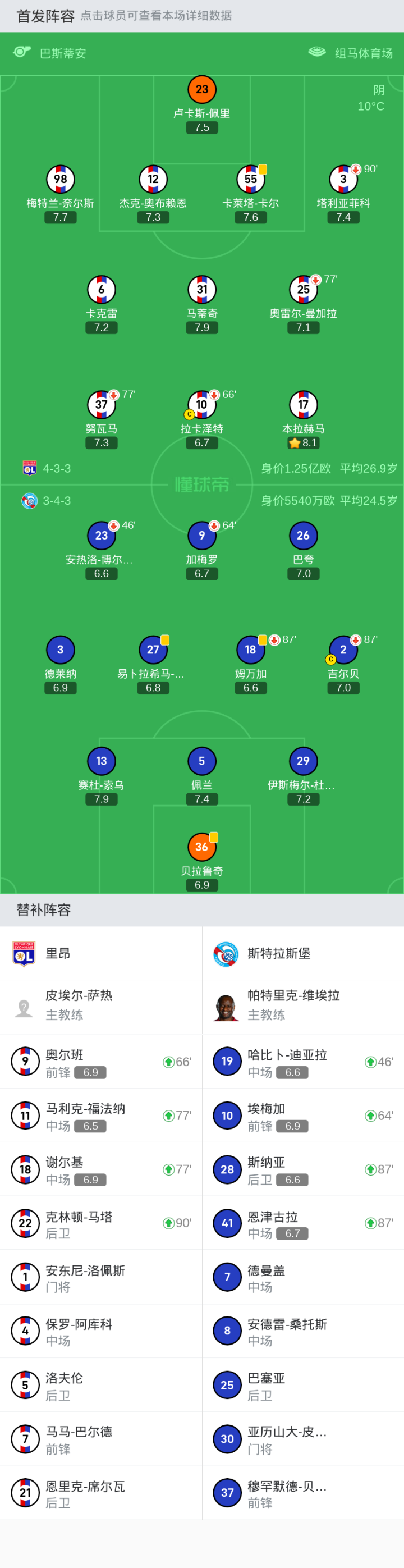 里昂首发:31-马蒂奇, 10-拉卡泽特, 3-塔利亚菲科, 55-卡莱塔-卡尔, 98-梅特兰-奈尔斯, 17-本拉赫马, 25-奥雷尔-曼加拉, 23-卢卡斯-佩里, 6-卡克雷, 12-杰克-奥布赖恩, 37-努瓦马