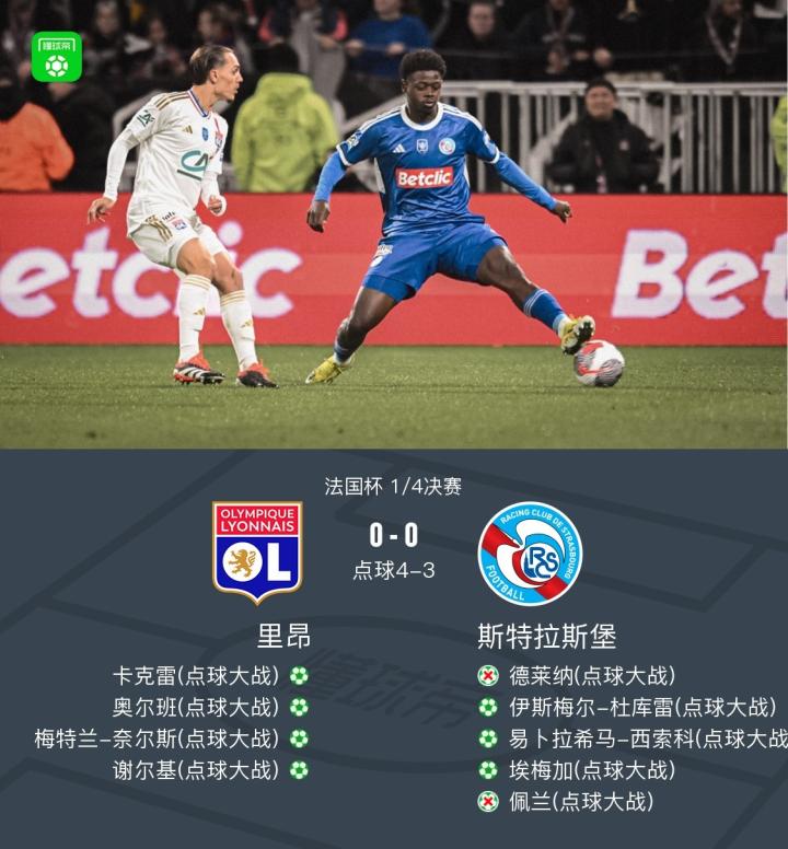 法国杯:点球大战里昂4-3斯特拉斯堡,德莱纳、佩兰失点