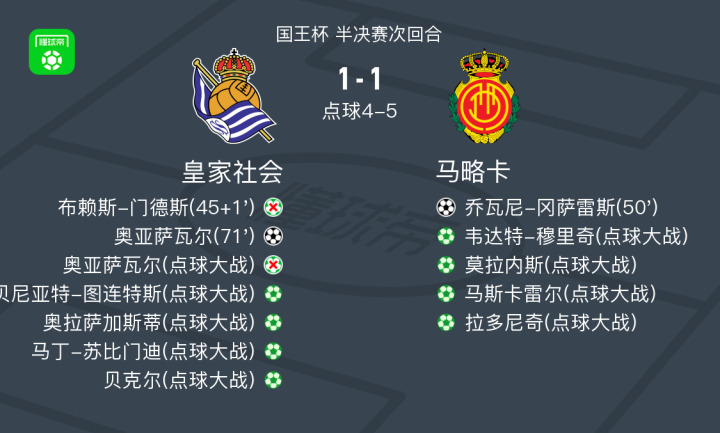 北京时间2月28日国王杯 半决赛次回合,皇家社会主场对阵马略卡。皇家社会奥亚萨瓦尔破门。马略卡乔瓦尼-冈萨雷斯破门。最终比分5-6。