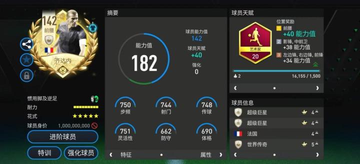 天赋方面,司职前腰的齐达内配备了艺术家,对他的加速、射门、短传、盘带、控球五项数据提升显著。花式方面,齐达内的花式星级达到5星,基础花式为马赛回旋,结合顶级的手感,他的持球进攻能力相当出色。