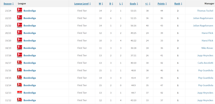 从数据上我们也能看到,图赫尔的拜仁上半程所拿分数,是仅次于瓜迪奥拉的三年的。