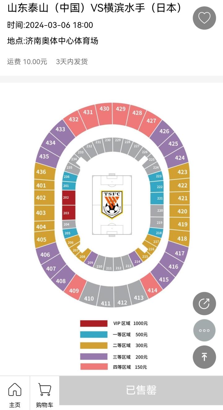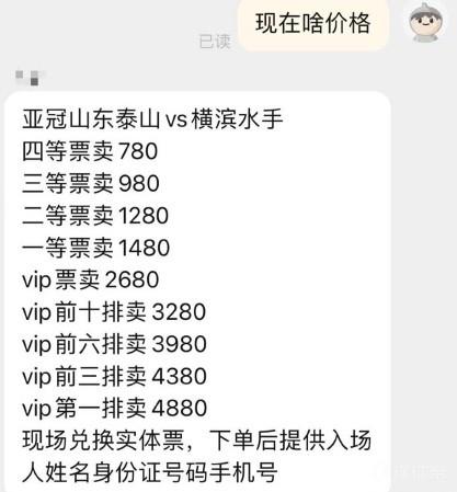 亚冠1/4决赛山东泰山主场vs横滨水手的球票今天上午10点开票,目前已经售罄。球票价格分5个档位,最低档150元,最高档1000元。
