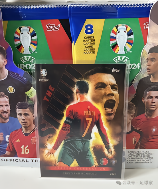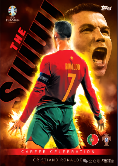 名单仅有C罗一人的Siuuu,超大比例插入,插入比例1:500包,是整盒装(Display/Packet Box)独占的特卡,平均13-14盒才能拆到1张,以C罗进球后标志性的庆祝动作为选图,设计相当精美,也是这次欧洲杯MA的主要Hit之一,其稀有程度堪比欧冠MA中的哈兰德打座SSP特卡。