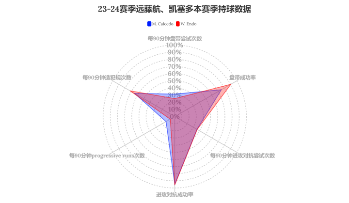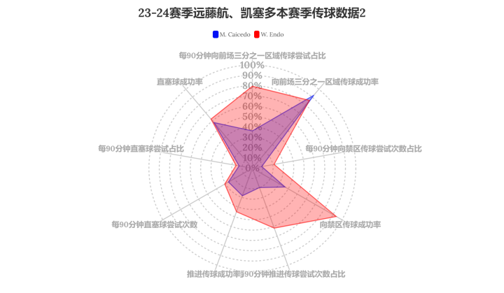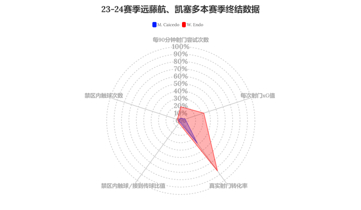 ※远藤航、凯塞多对比※鉴于图一这种数据过于简单,...远方的博哈多尔角 @懂球帝2024-02-28 23:50※远藤航、凯塞多对比※ 鉴于图一这种数据过于简单,我决定用更加细一点的数据来给这两人做个比对。 数据来源:wyscout 图二到图六为两人各项指标的雷达图,蓝色是凯塞多的表现,红色是远藤航的表现。 目前攻防数据来看,远藤航确实是比较出彩的那个。展开更多