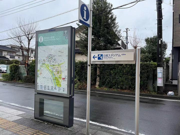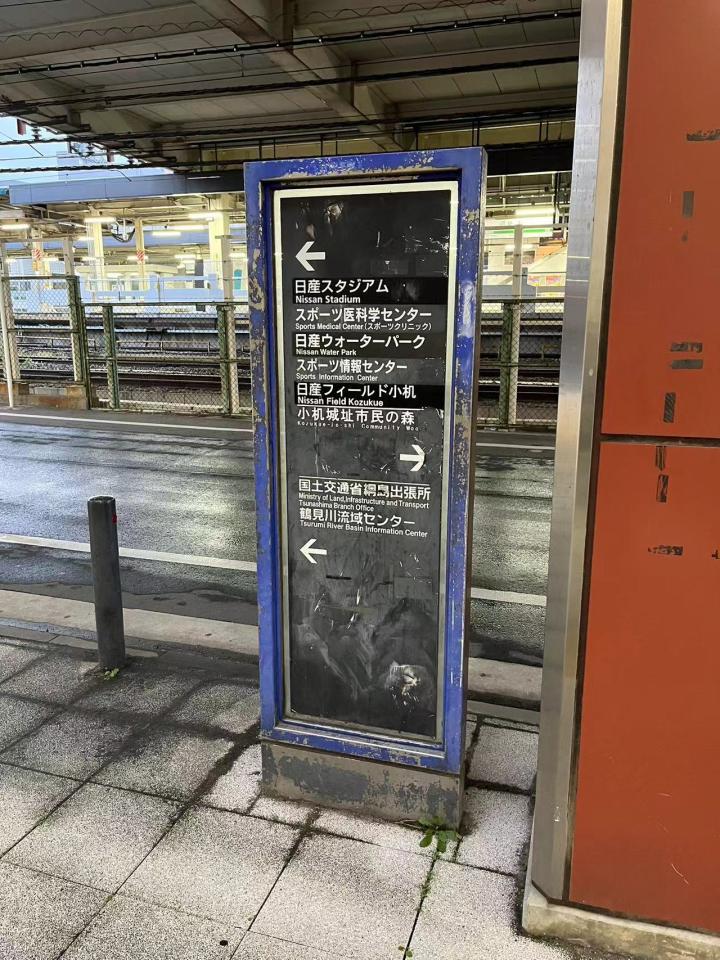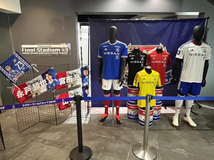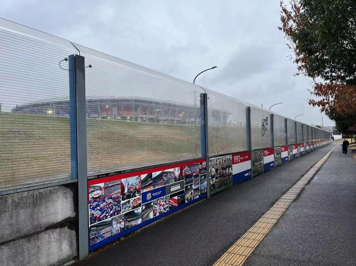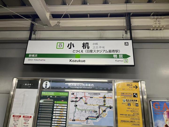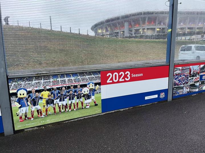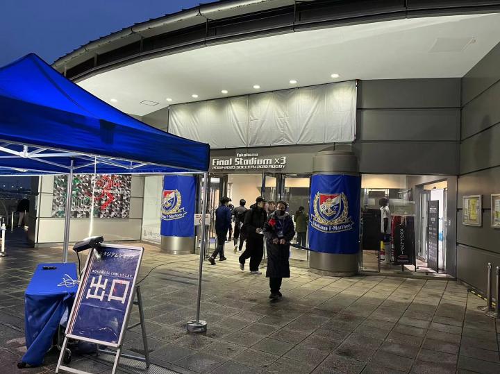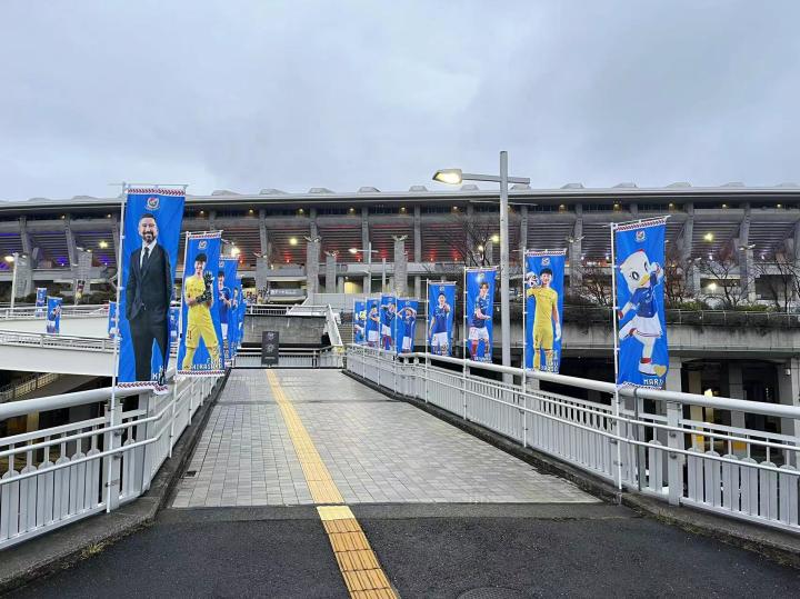 前往横滨国际综合竞技场可以坐JR横滨线到小机站或JR横滨线、横滨市营地铁蓝线到新横滨站,从小机站需要步行10分钟到西看台入口,从新横滨站需要步行20分钟到东看台入口。我是坐到小机站,在地铁站里就开始看到横滨水手的宣传标识了,出站前往球场需要穿过一片社区,指示标识很明确,沿途也都布满球队的各种宣传画。横滨国际综合竞技场位于一个山坡上,穿过一条高速公路再爬一段台阶就看到了球场,从新任主教练科威尔到所有球员再到吉祥物的旗帜整整齐齐的树立在球场周围。