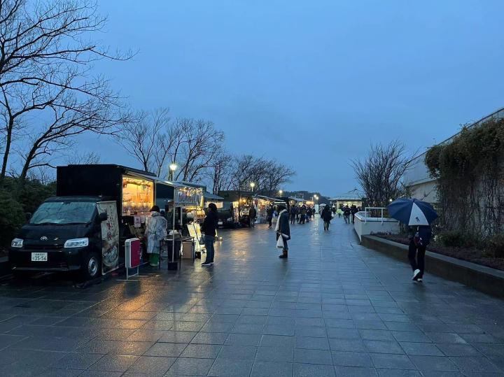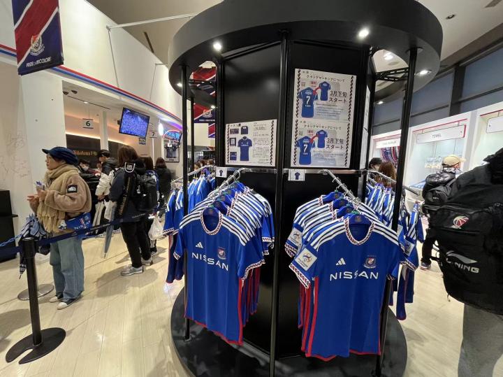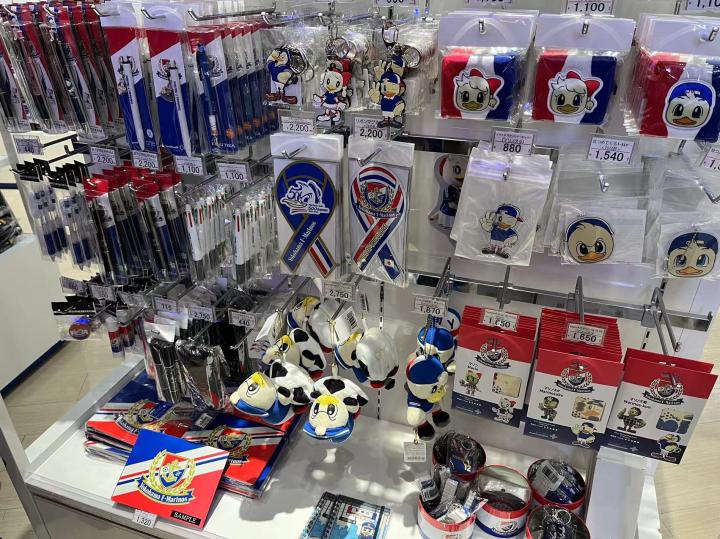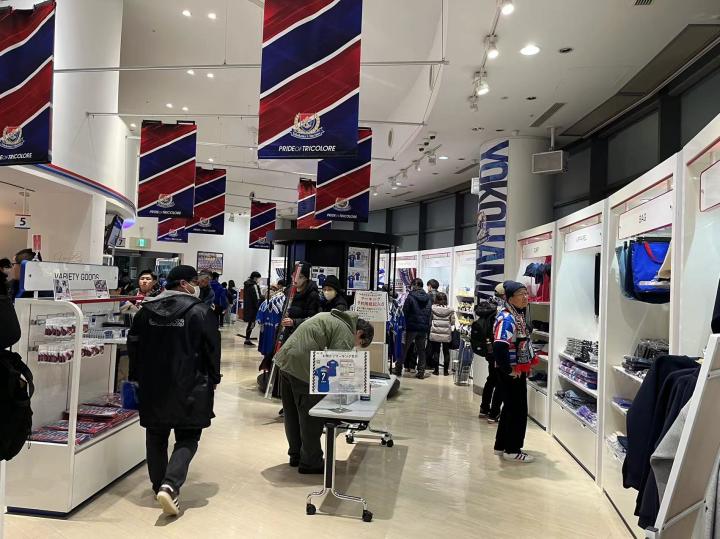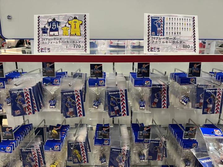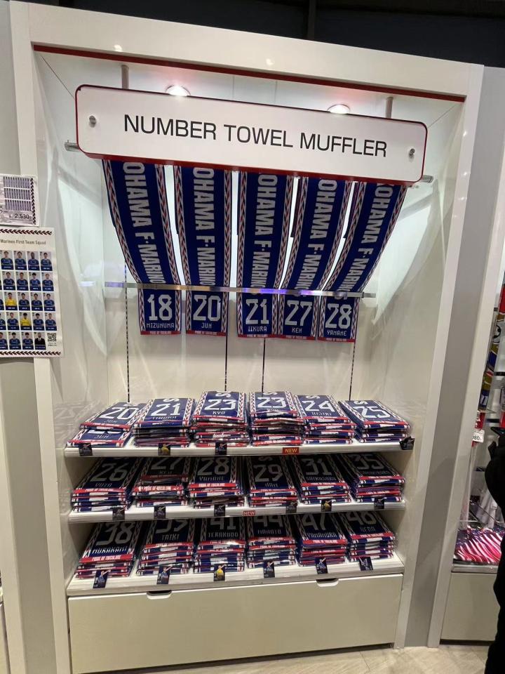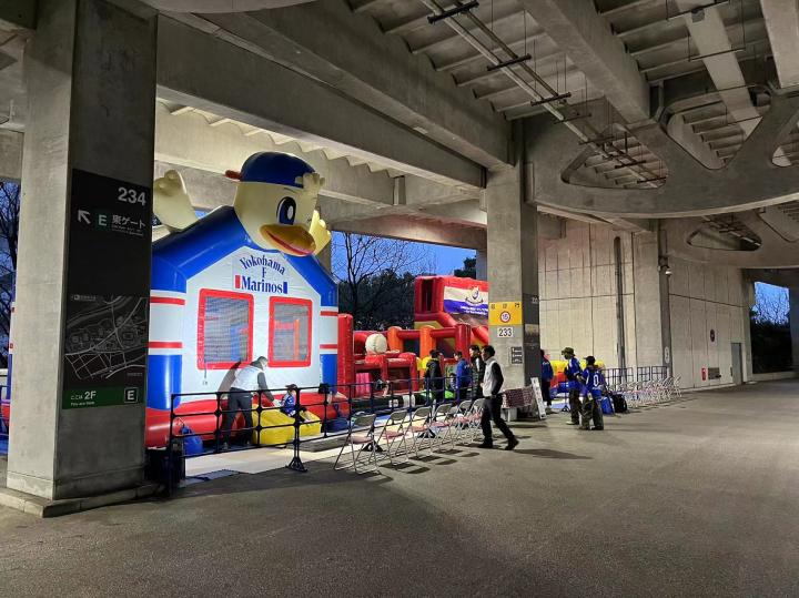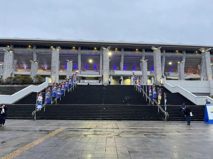 我们在现场买球票选了长边侧面的位置,票价4100日元(含100元纸质票手续费)。球场周围的摊位可以购买食品和饮料,由于天气寒冷还有老大爷在门口免费发放暖宝宝,暖宝宝上面都是日语,他们贴上了英语和泰语的使用说明并用这两种语言写上了“欢迎来到横滨水手主场”,细节拉满。虽然一直在下雨,体育场门口的球迷商店已经开始排大队了,商品种类依然十分丰富,从亚冠版的球衣到每个球员的应援产品再到球员玩偶盲盒应有尽有。