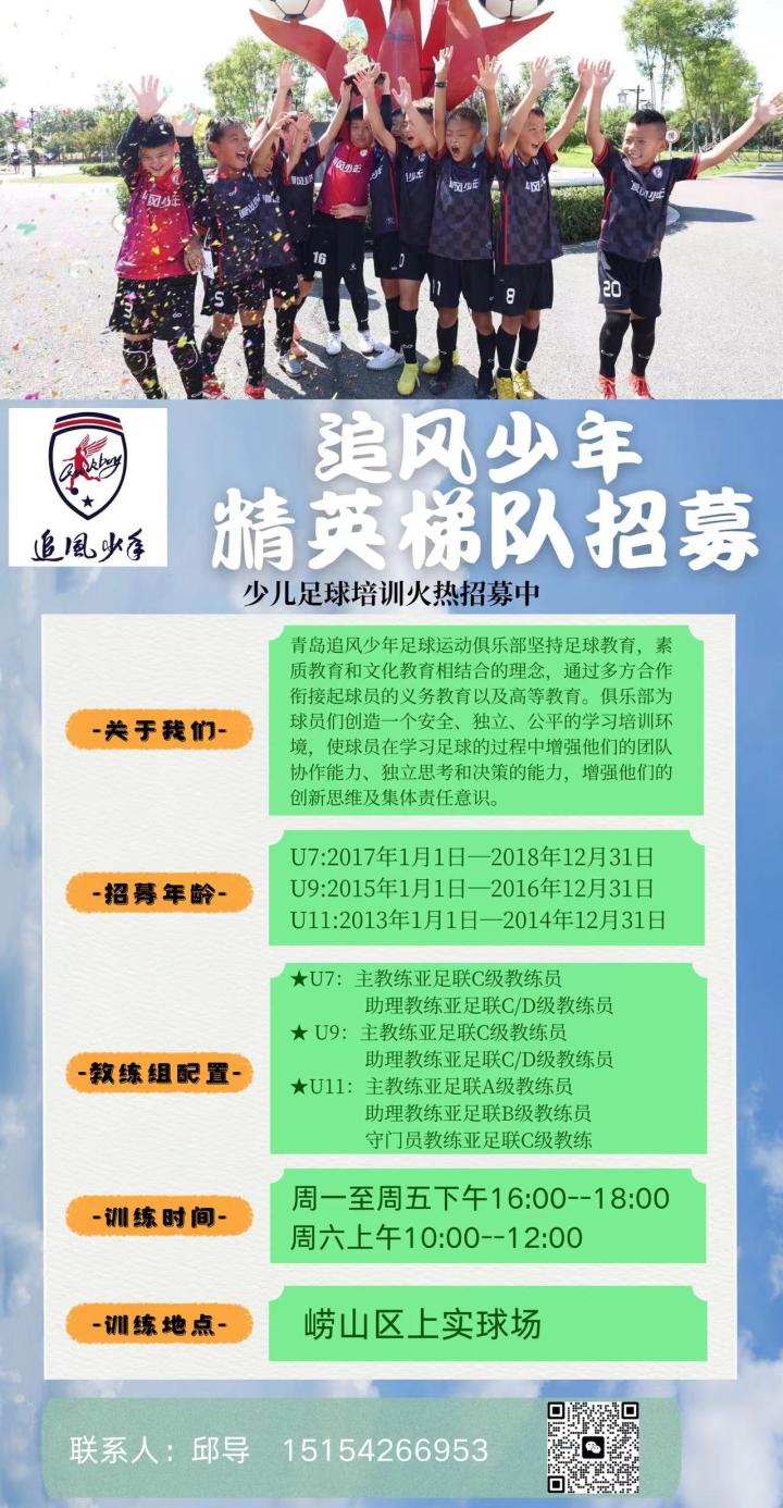 青岛追风少年足球俱乐部为进一步完善俱乐部梯队建设,促进俱乐部可持续长远发展,增强青少年足球人才储备,青岛追风少年足球俱乐部现面向全社会公开招募U7、U9、U11三级精英梯队球员。