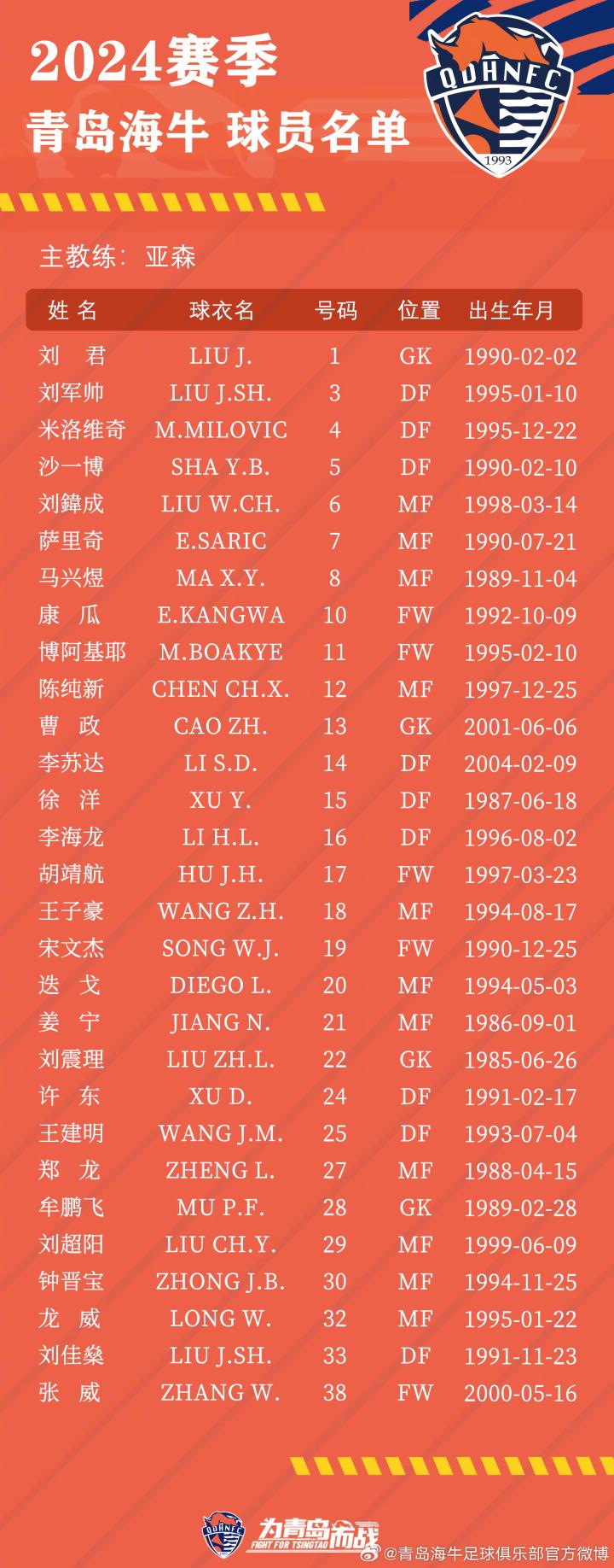 张威38号,刘军帅改3号,迭戈20号,青岛海牛公布大名单