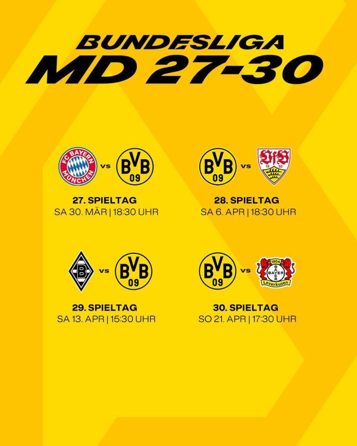 🗓️我横德甲第27到30轮赛程(以下时间均为北京...多特蒙德足球俱乐部 @懂球帝2024-03-01 10:14🗓️我横德甲第27到30轮赛程(以下时间均为北京时间): ✈️3月31日 凌晨1:30 vs 拜仁慕尼黑 🏟️4月7日 凌晨0:30 vs 斯图加特 ✈️4月13日 晚21:30 vs 门兴格拉德巴赫 🏟️4月21日 晚23:30 vs 勒沃库森 *当地时间3月31日将进入夏令时展开更多