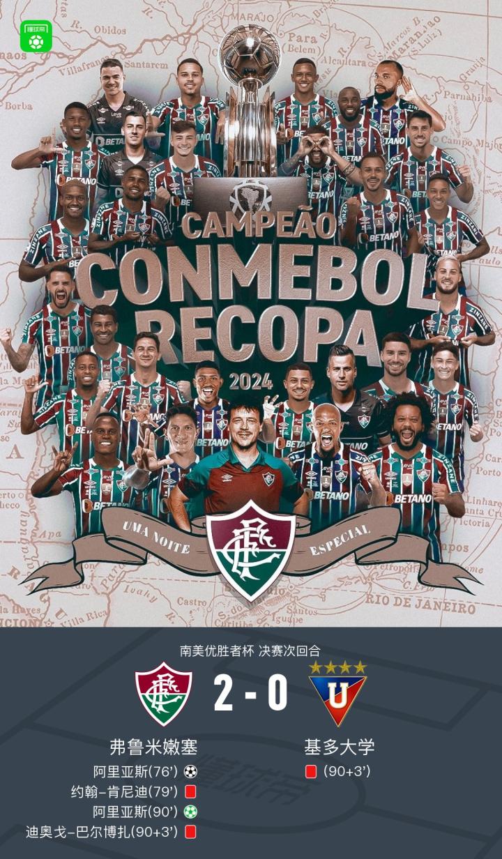 北京时间3月1日南美优胜者杯 决赛次回合,弗鲁米嫩塞主场对阵基多大学。上半场双方战平,主队优势明显,频频在对方门前造险。客队全员退防半场防守,偶尔打出反击,但都为形成威胁。下半场,萨穆埃尔-沙维尔助攻阿里亚斯破门。约翰-肯尼迪进攻犯规,吃到红牌被罚下。奥古斯托造点,阿里亚斯主罚命中,完成梅开二度。补时最后阶段,迪奥戈-巴尔博扎、阿尔卡塞尔吃到红牌被罚上看台。最终弗鲁米嫩塞以两回合总比分2-1战胜基多大学,首次问鼎南美优胜者杯冠军。