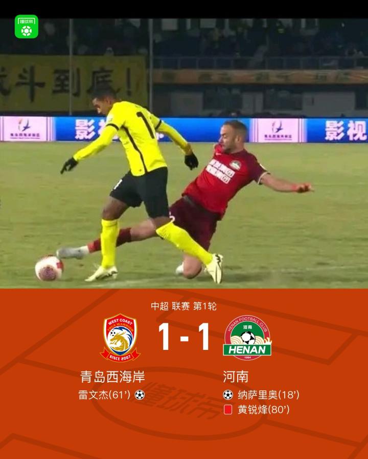 北京时间3月1日中超 联赛 第1轮,青岛西海岸主场对阵河南。上半场纳萨里奥轰出世界波斩获河南生涯处子球,下半场里亚斯科斯边路强吃送出助攻,雷文杰破门斩获队史中超首球,比赛尾声黄锐烽肘击张修维,VAR介入后出示红牌。最终西海岸1-1战平十人河南。