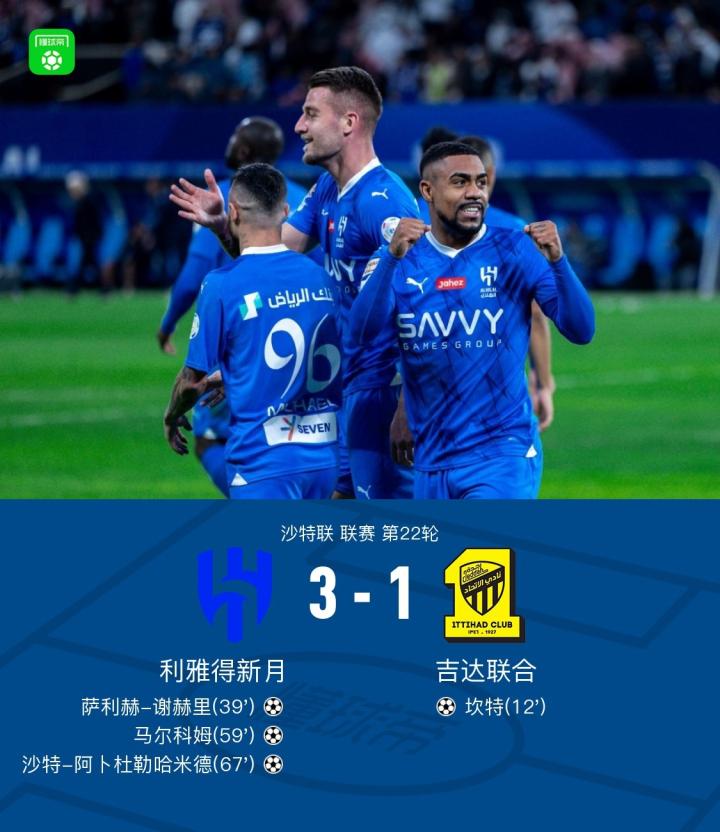 北京时间3月2日沙特联 联赛 第22轮,利雅得新月主场对阵吉达联合。上半场豪萨维左路传中,坎特冲顶头球破门先拔头筹,加姆迪弧顶处凌空打门被扑,谢赫里禁区内一脚低射破门将比分扳平,下半场米林科维奇送出助攻,马尔科姆破门将比分逆转,阿卜杜勒哈米德内切一条龙破门锁定胜局,全场战罢,最终比分3-1。