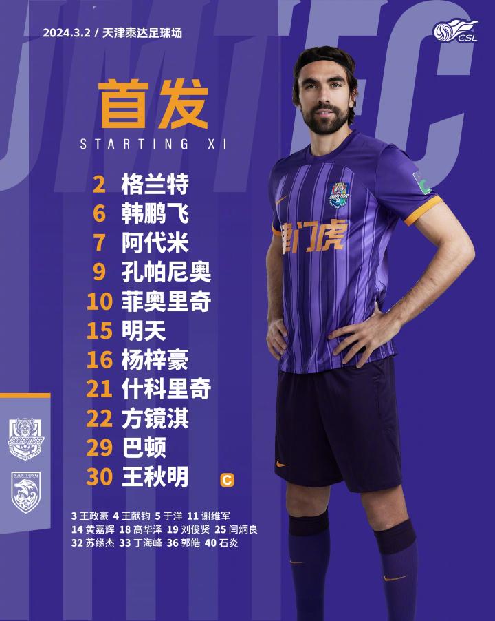 全员出战,津门虎是中超五外援时代首支派出五外援首发的球队ZeroTsu_02 @懂球帝2024-03-02 14:47北京时间3月2日下午15:30,中超第1轮,天津津门虎主场迎战南通支云,赛前双方公布首发。天津津门虎首发:22-方镜淇、2-格兰特、6-韩鹏飞、7-阿代米、9-孔帕尼奥、10-菲奥里奇、15-明天、16-杨梓豪、21-什科里奇、29-巴顿、30-王秋明。天津津门虎五位外援格兰特、什科里奇、菲奥里奇、孔帕尼奥、阿代米联袂出场,成为中超五外援时代首支派出五外援首发的球队。展开更多