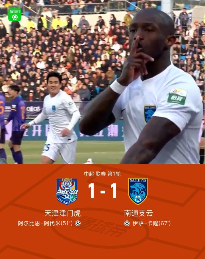 津门虎1-1南通,阿代米先拔头筹,伊萨-卡隆替补救主