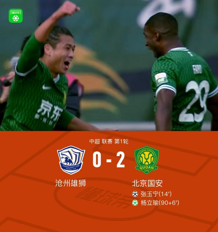 北京时间3月2日中超联赛第1轮,沧州雄狮主场对阵北京国安。比赛第14分钟,王刚助攻张玉宁破门,补时第6分钟,阿德本罗造点,杨立瑜点射得分。最终比分沧州0-2国安。