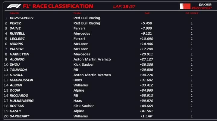所有车手完成进站后,维斯塔潘、佩雷兹位列前二,拉塞尔第三,乐扣、塞恩斯分列四五。周冠宇第9,博塔斯第18。