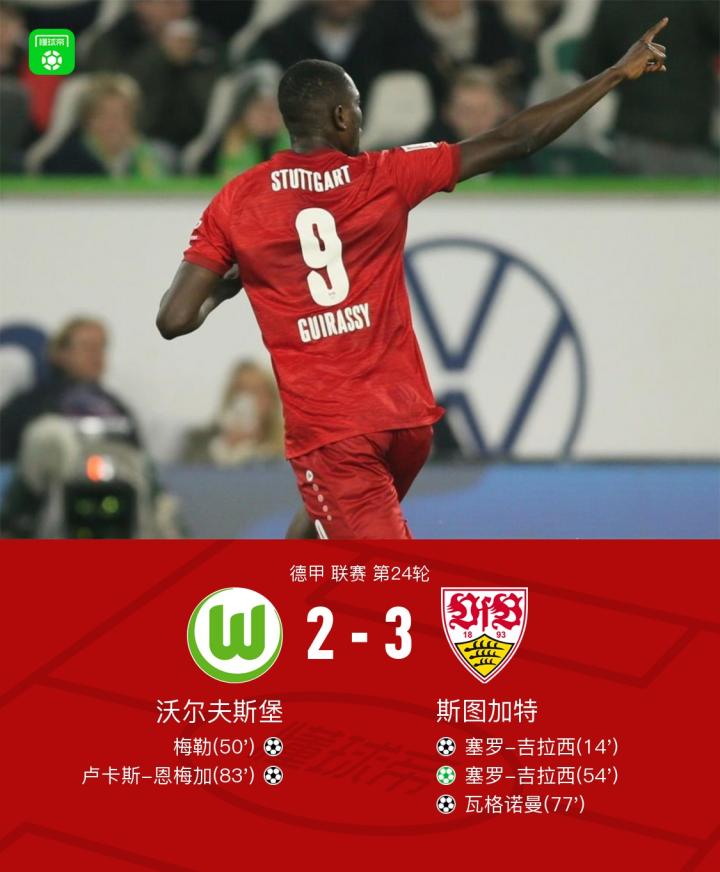北京时间3月3日德甲 联赛 第24轮,沃尔夫斯堡主场对阵斯图加特。上半场,米特尔施泰特助攻塞罗-吉拉西破门,率先打破场上僵局。下半场,梅勒破门将比分扳平,转头梅勒吃到黄点套餐,塞罗-吉拉西主罚命中。瓦格诺曼、阿明-萨尔进球被吹越位。瓦格诺曼破门扩大比分,卢卡斯-恩梅加破门再次缩小比分。最终沃尔夫斯堡主场2-3不敌斯图加特。