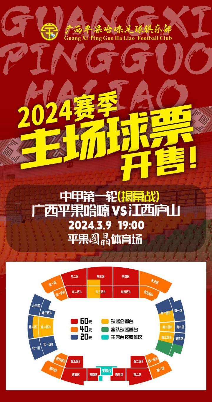 开票!2024中甲联赛开幕式及揭幕战:广西平果哈...广西平果哈嘹足球俱乐部 @懂球帝2024-03-03 10:21开票!2024中甲联赛开幕式及揭幕战:广西平果哈嘹VS江西庐山,3月9日主场球票现已开售,关注公众号:广西平果哈嘹足球俱乐部有限公司,点击菜单或进入“看个比赛”APP即可线上购买,优先选座,数量有限,主场套票同步发售,快为广西球队呐喊助威吧!还能观看精彩演出!战斗!广西队!展开更多