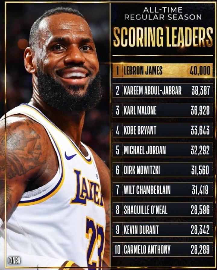 NBA历史得分榜前十:詹姆斯成首位4万分先生,杜兰特位列第九
