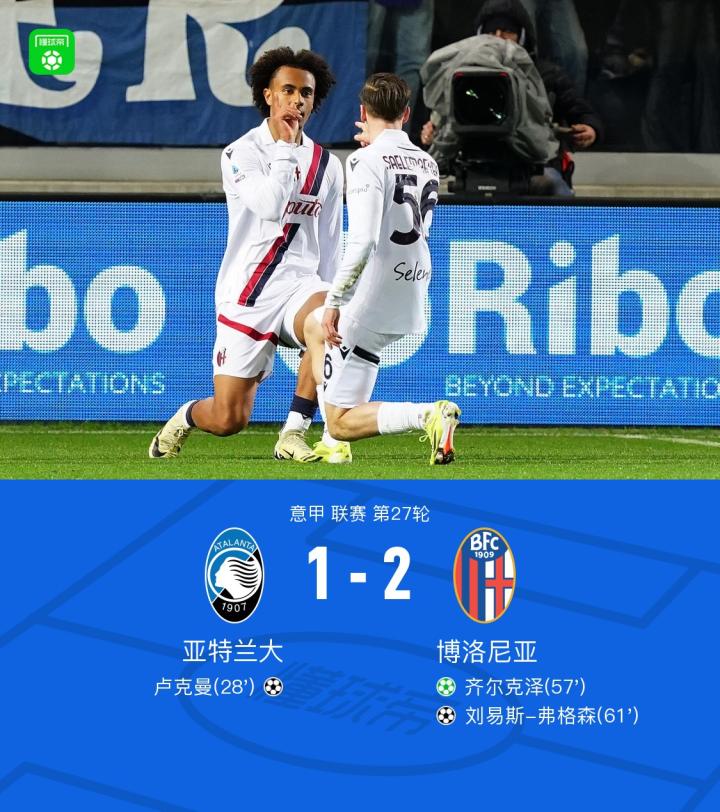 北京时间3月4日意甲 联赛 第27轮,亚特兰大主场对阵博洛尼亚。上半场,卢克曼门前补射破门,率先改写比分。下半场,萨勒马克尔斯造点,齐尔克泽主罚命中将比分扳平。四分钟后,刘易斯-弗格森弧顶直接抽射破门将比分反超。最终博洛尼亚客场2-1逆转亚特兰大。