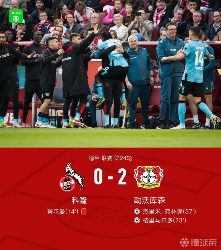 【勒沃库森客场2-0科隆10分领跑德甲,弗林蓬、格里马尔多建功】