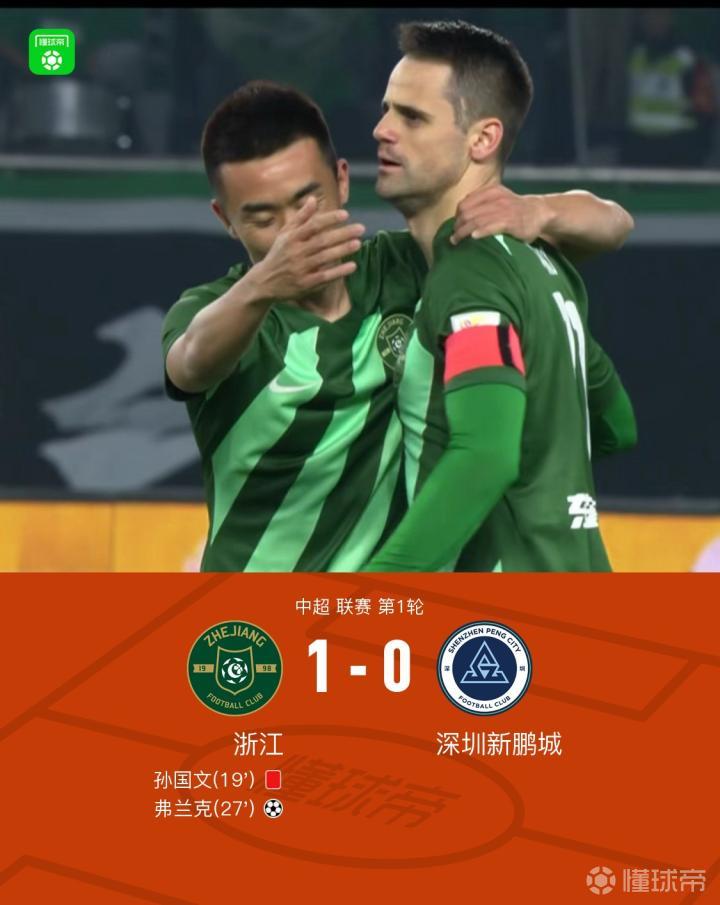 【十人浙江1-0新鹏城迎开门红,孙国文首秀吃直红,弗兰克制胜】