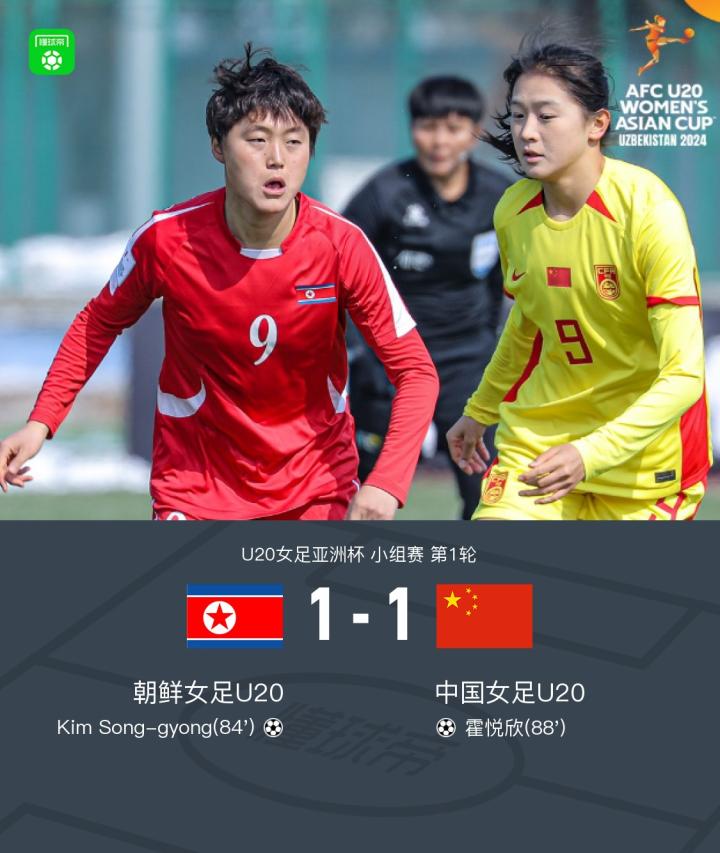 北京时间3月4日U20女足亚洲杯小组赛第1轮,朝鲜女足U20对阵中国女足U20。比赛第7分,卢家玉进球被吹,比赛第84分钟,朝鲜女足Kim Song-gyong远射破门,第88分钟,霍悦欣超级世界波破门。最终比分1-1。