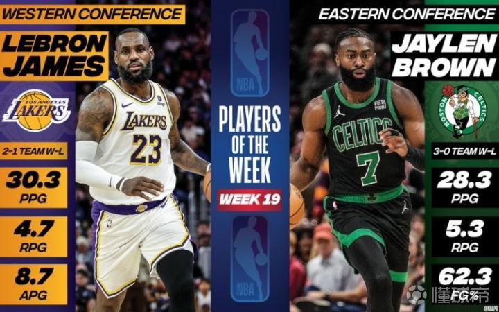 北京时间3月5日,NBA官方宣布,波士顿凯尔特人队的杰伦-布朗和洛杉矶湖人队的勒布朗-詹姆斯,分别当选常规赛第19周的东西部周最佳球员。